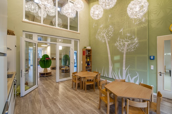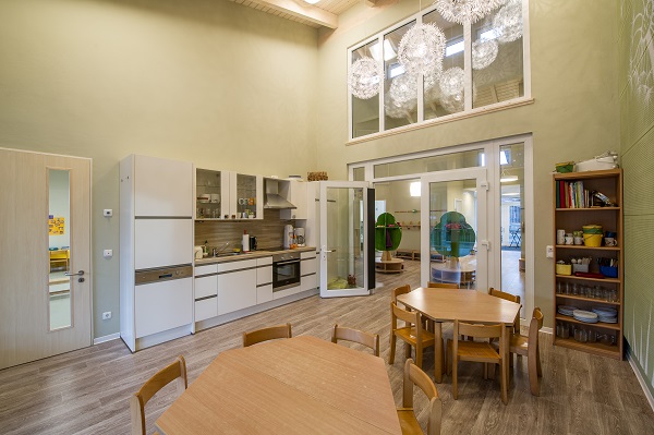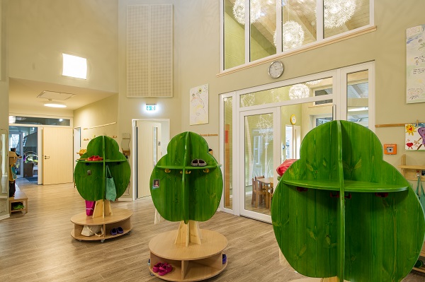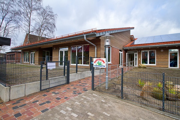 Der Pultdach-Neubau wurde mit einer Photovoltaik-Anlage ausgestattet, die über 50% des Gesamtenergieverbrauches produziert. Der Massivbau zeichnet sich optisch durch die wechselnde Fassade aus Fenstern und Türen mit 3-fach Verglasung, dem „ortstypischen“ roten Verblendmauerwerk und einer waagerechten Rhombusverschalung aus Lärchenholz aus. Mit dem neuerstellten Anbau an die bestehende Grundschule wurde im größeren Gebäudeteil Platz für 53 Kindergartenkinder geschaffen. Der kleinere Teil beherbergt eine Krippe für 15 Kinder. Alle Zugänge der Innenbereiche, sowie das Außengelände wurden barrierefrei gestaltet.
