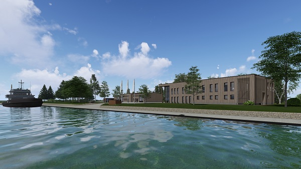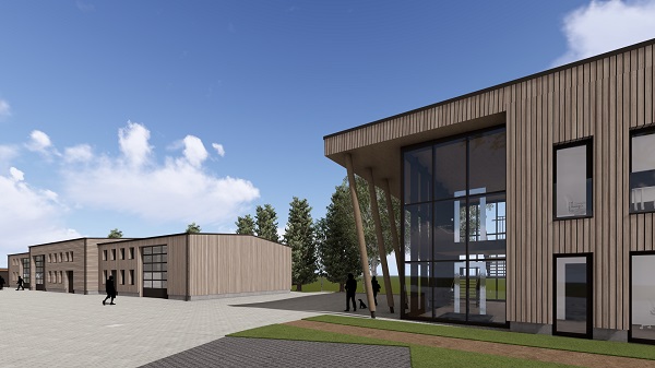 Der Neubau des zweigeschossigen Verwaltungsgebäudes umfasst einen Sozialbereich mit Duschen und Umkleiden sowie Büroräume und Gemeinschaftsflächen. Ab der Sohle wird das Gebäude als reiner Holzbau errichtet und die Fassaden als vertikale naturbelassene Holzverschalung ausgeführt. Optisch markant sind in diesem Entwurf das wiederholende Fensterraster und der großzügig verglaste Eingangsbereich, welcher mit Holzstützen betont wird. Das Pultdach wird extensiv begrünt und mit PV-Anlage ausgestattet. Die Bestandshalle wird nach Ost und West erweitert und wird mit einer neuen und energetisch höherwertigen Holzfassade versehen. Der Bestand erhält eine horizontale und die beiden angebauten Hallenteile eine vertikale Verschalung, beides in naturbelassenem Holz. Die Anbauten springen nach Innen und ordnen sich seitlich dem Bestand unter. Die Dächer werden als flache Satteldächer geplant, welche mit einer PV-Anlage ausgestattet sind.