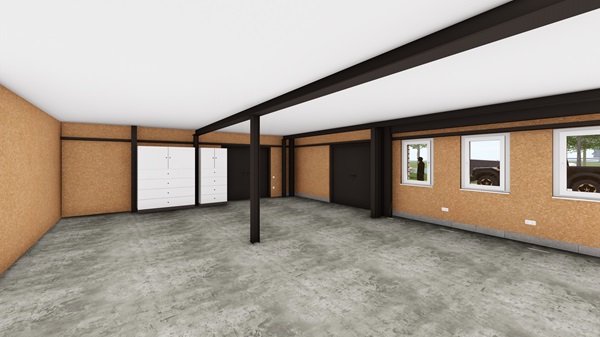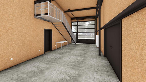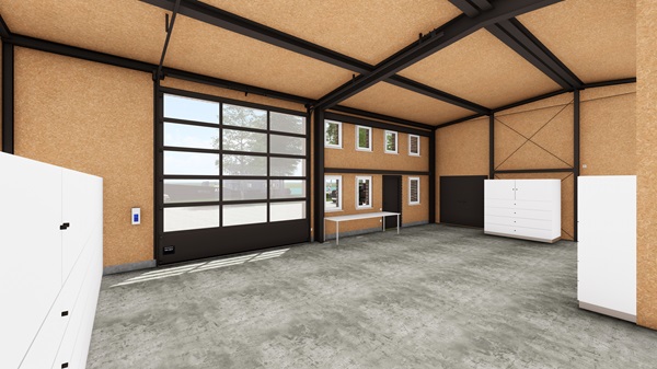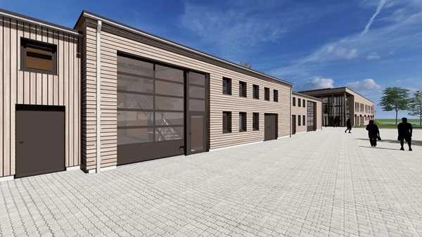 Der Neubau des zweigeschossigen Verwaltungsgebäudes umfasst einen Sozialbereich mit Duschen und Umkleiden sowie Büroräume und Gemeinschaftsflächen. Ab der Sohle wird das Gebäude als reiner Holzbau errichtet und die Fassaden als vertikale naturbelassene Holzverschalung ausgeführt. Optisch markant sind in diesem Entwurf das wiederholende Fensterraster und der großzügig verglaste Eingangsbereich, welcher mit Holzstützen betont wird. Das Pultdach wird extensiv begrünt und mit PV-Anlage ausgestattet. Die Bestandshalle wird nach Ost und West erweitert und wird mit einer neuen und energetisch höherwertigen Holzfassade versehen. Der Bestand erhält eine horizontale und die beiden angebauten Hallenteile eine vertikale Verschalung, beides in naturbelassenem Holz. Die Anbauten springen nach Innen und ordnen sich seitlich dem Bestand unter. Die Dächer werden als flache Satteldächer geplant, welche mit einer PV-Anlage ausgestattet sind.