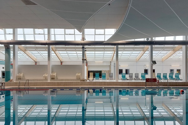 Bei dem Celler Badeland handelt es sich um ein Spiel- und Spaßbad mit den Anfängen in den frühen 60er Jahren. Über die Jahrzehnte hinweg wurde oft an- und umgebaut und es ergab sich ein inhomogener Baukörper. Im Zuge einer geförderten energetischen Sanierung für Sportstätten wurden das Glasdach, sowie Teile der Fassade erneuert, aber auch die Maßnahme soweit erweitert, dass die Hauptgebäudeteile nun als einheitliches Fassadenbild wirken. Hierfür wurden als Farben beige wie Sand und blau wie das Wasser gewählt. Die blauen Felder zeigen bei Dunkelheit, thematisch passend, ein Wellenbild. Im Inneren ist die markanteste Veränderung der Austausch einer geneigten Glasfassade, die um weitere Glasdachfläche verlängert wurde. So ist es gelungen viel mehr Licht in das Gebäude zu bekommen. Durch die energetische Sanierung kann bereits jetzt bis zu 40% der Heizenergie eingespart werden. Ergänzt wurden die Maßnahmen durch den Einsatz von neuen Gründächern im Sinne der Biodiversität und als Schutz vor dem sommerlichen Wärmeeintrag. Derzeit wird ein weiterer Bauabschnitt zur Fortsetzung der Sanierung geplant.